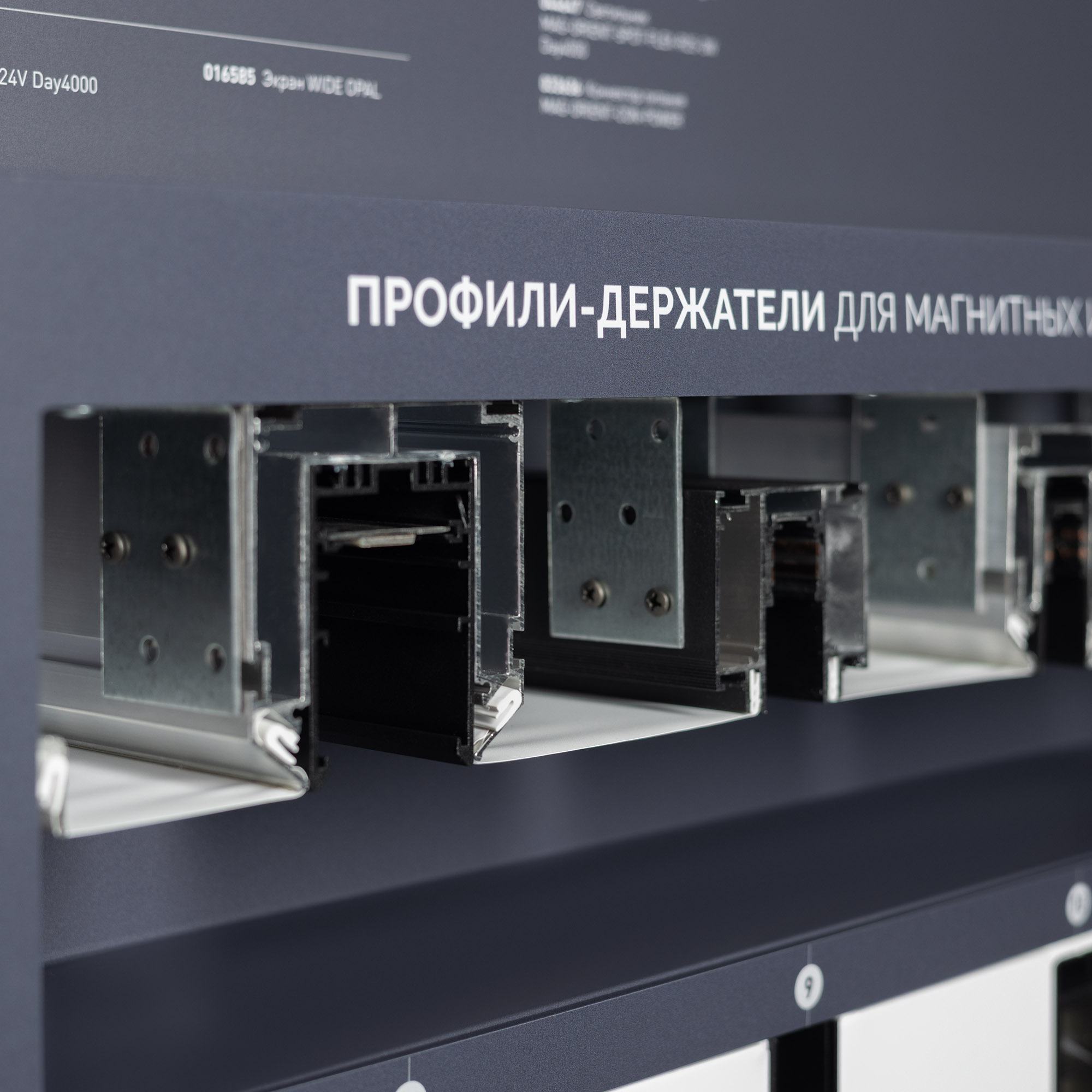 На стенде представлен ассортимент профилей Arlight для натяжных потолков: Профиль серии FOLED, совмещающий в своей конструкции каркас для крепления натяжного потолка и профиль для установки светодиодной ленты. Профиль-держатель MAG STRETCH для установки магнитных треков в натяжной потолок.