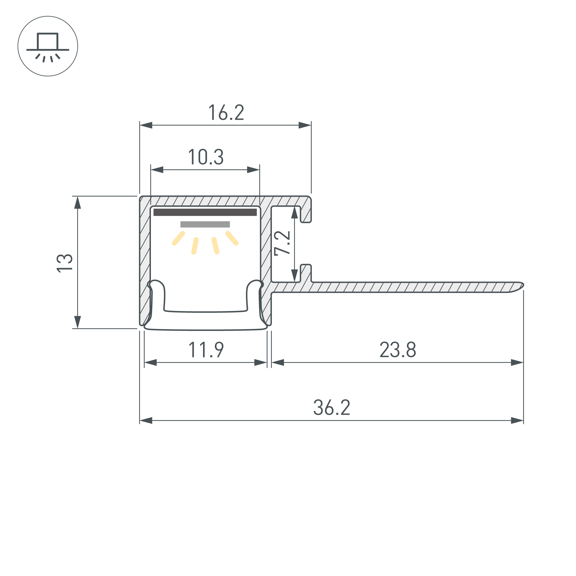 Габаритные размеры профиля составляют 2000 мм в длину, 36,2 мм в ширину и 13 мм в высоту. Площадка для установки светодиодных лент позволяет использовать ленту шириной до 10,3 мм и мощностью до 12 Вт/м. Это обеспечивает гибкость в выборе светодиодных лент и создает потрясающие световые решения.