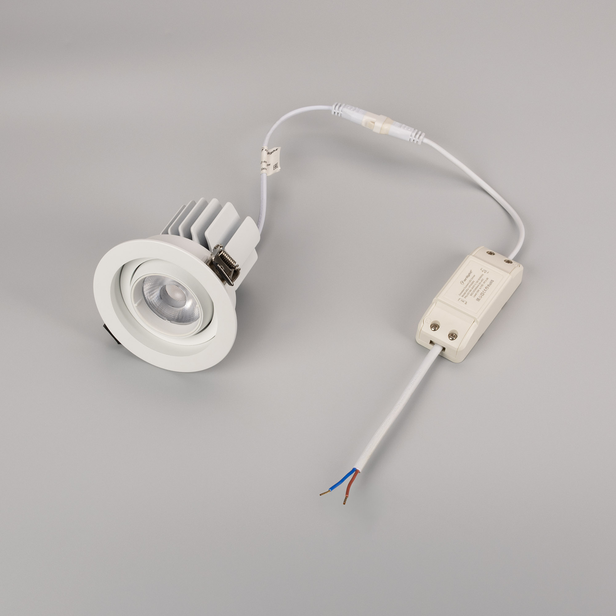 Встраиваемый карданный светильник. Мощность 12 Вт, св. поток 1394 лм, 115 лм/Вт, тёплый 3000 K, CRI>92, угол 40°, напряжение питания 230 В. Белый корпус из алюминия, белая вставка, степень защиты IP20. Размер: диаметр 90мм, высота 80 мм. Монтаж встраиваемый, установочное отверстие: диаметр 75 мм. Драйвер 27-40 В, 300 мА, пульсация <2%.