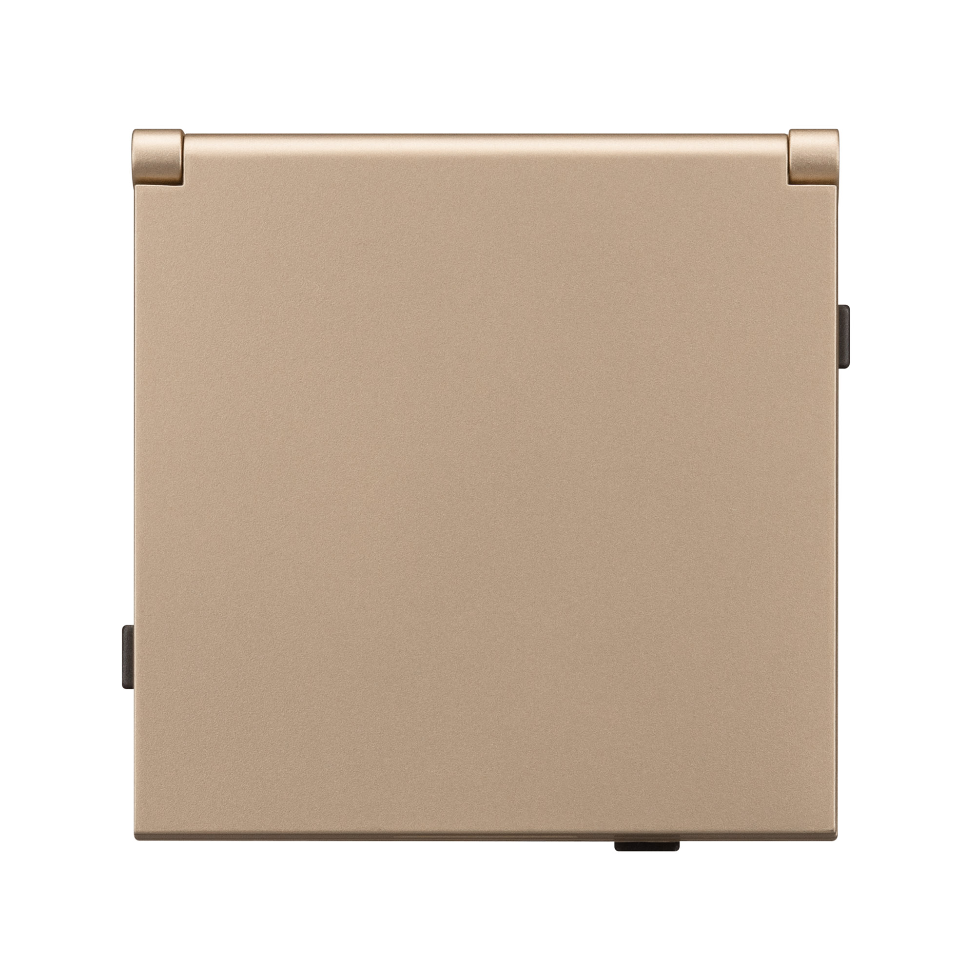 Механизм розетки с заземлением и влагозащитной крышкой на 1 пост. Цвет - золотой. Без фронтальной рамки. Уровень пылевлагозащиты IP44. Розетка устанавливается в стандартный подрозетник круглого сечения диаметром 60мм.