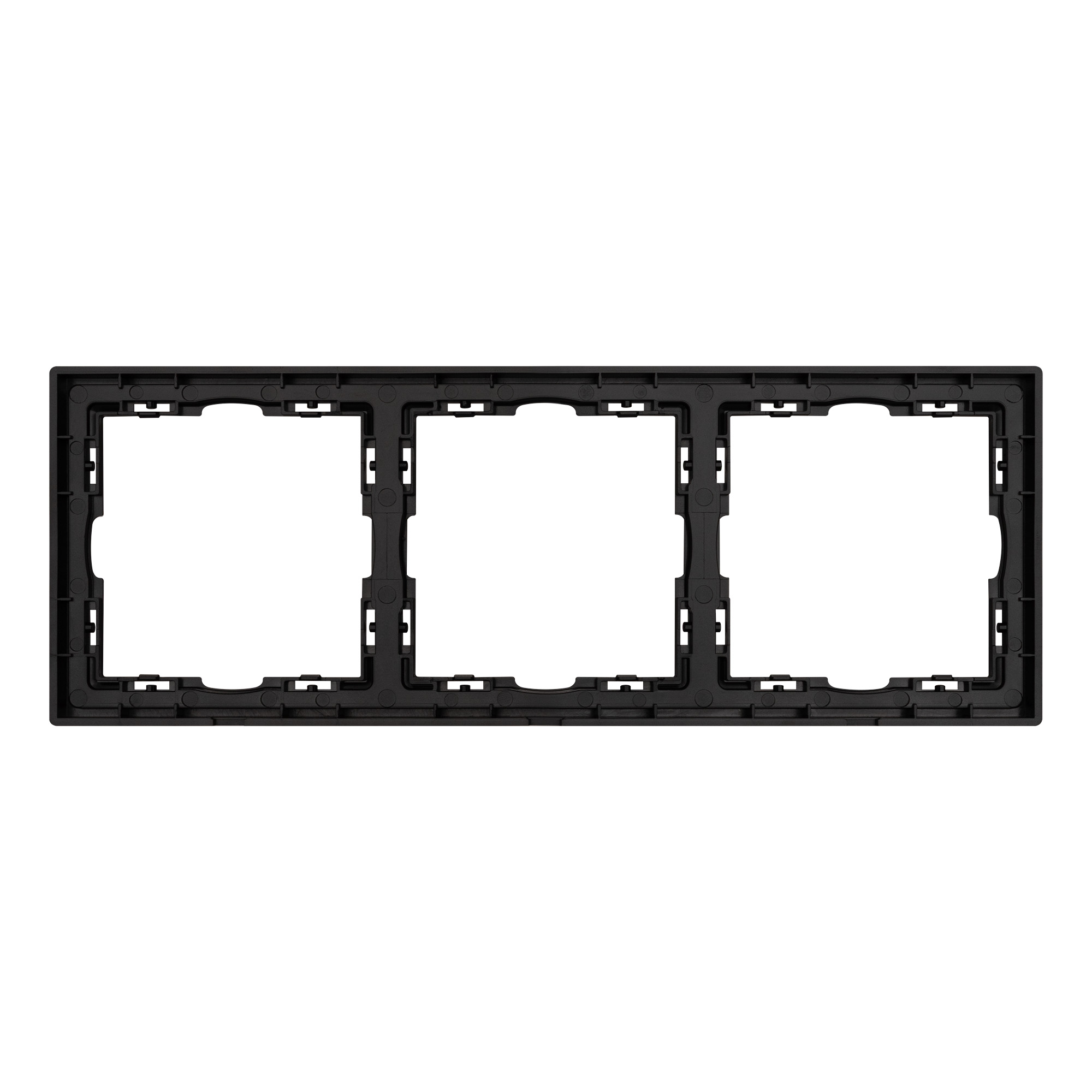 Рамка пластиковая на 3 поста, под встраиваемый механизм. Цвет - черный, с Soft-Touch покрытием. Среднего уровня герметичности IP20. Ориентация монтажа горизонтальная. Габаритные размеры: длина 223 мм, ширина 81 мм, высота 8.55 мм. Гарантийный срок 12 мес.