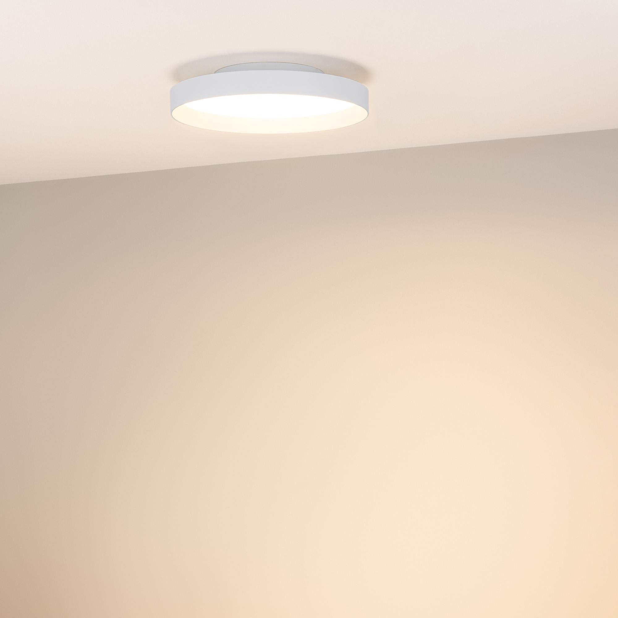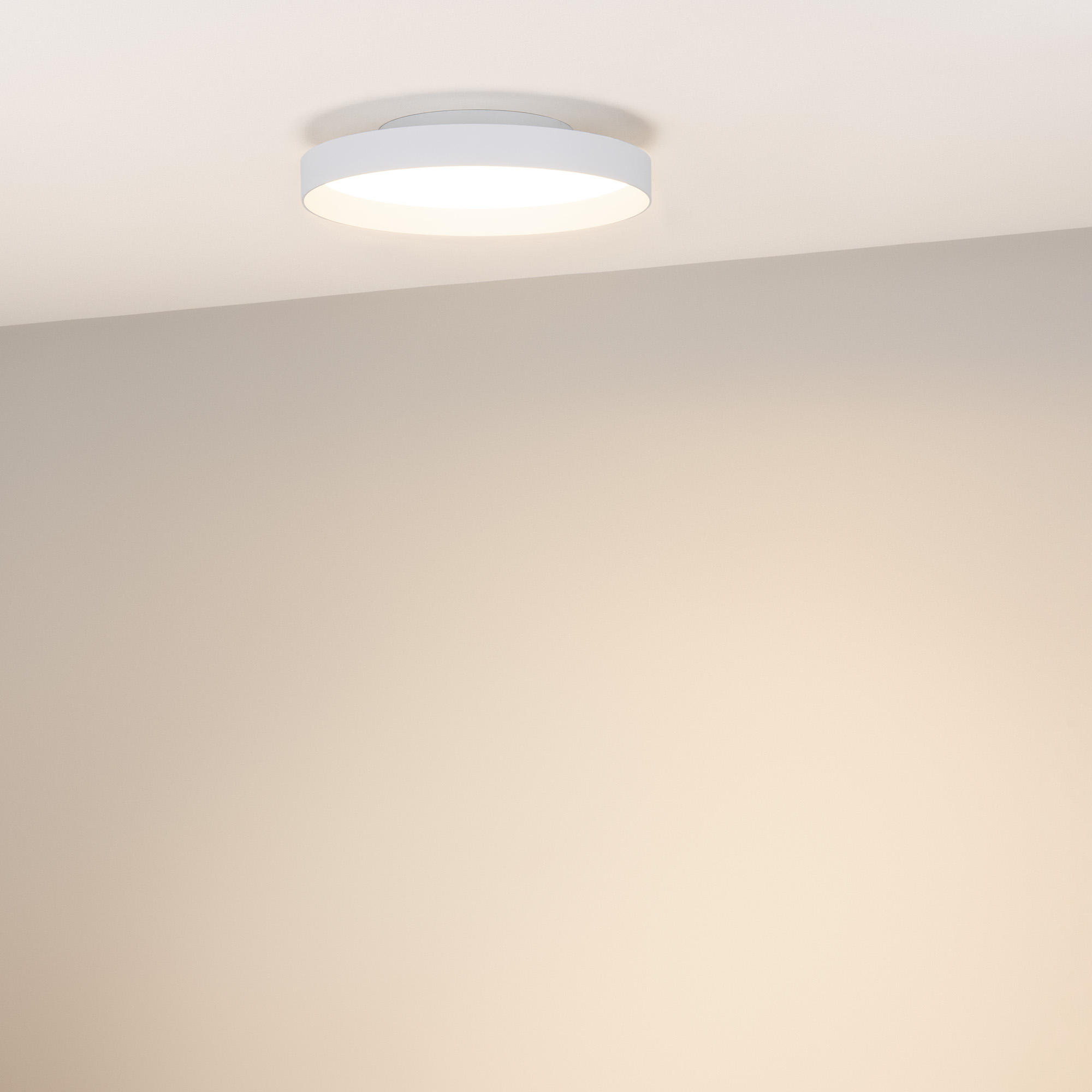 Светодиодный светильник с изменяемой цветовой температурой. Мощность 30 Вт, св. поток 2170-2400 лм, 80-95 лм/Вт, теплый 2700 K, теплый 3300 K, дневной 4000K (переключается), CRI>92, угол 80°, напряжение питания 230 В. Белый круглый корпус из алюминия, матовый призматический экран PC, степень защиты IP20. Размер: Ø 350х70 мм. Размер световой части: Ø 350х39 мм, размер основания: Ø 196х31мм. Монтаж накладной. Драйвер 26-42 В, 700 мА, пульсация <0,3%. Диммирование TRIAC.