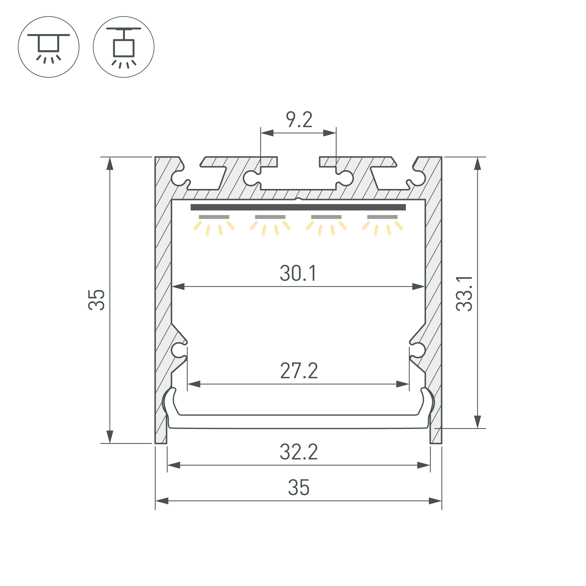 Алюминиевый светотехнический профиль специально предназначен для установки светодиодных лент или линеек. Цвет серебристый. Длина 2000 мм, сечение 35х35 мм. Профиль применяется для создания основного освещения в интерьерах. Монтаж осуществляется накладным либо подвесным способом. Предлагаются дополнительные аксессуары (экраны, заглушки и т.д.), позволяющие создать готовый светильник.