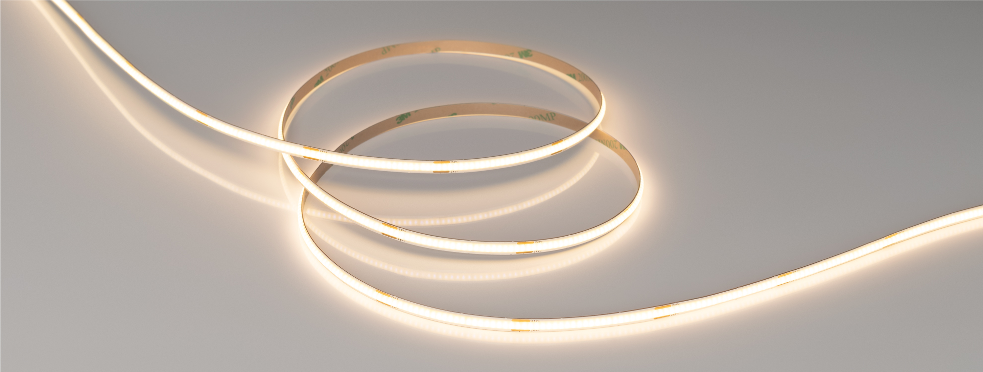 Основное преимущество бескорпусных лент COB — эффект сплошной линии света без применения рассеивателей (экранов). За счет заливки люминофором по всей длине ленты образуется равномерное свечение без видимых точек светодиодов. COB-ленты серии Х480 предназначены для декоративной подсветки интерьера, а также оформления рекламы и витрин. Тип светодиодов — CSP (X).