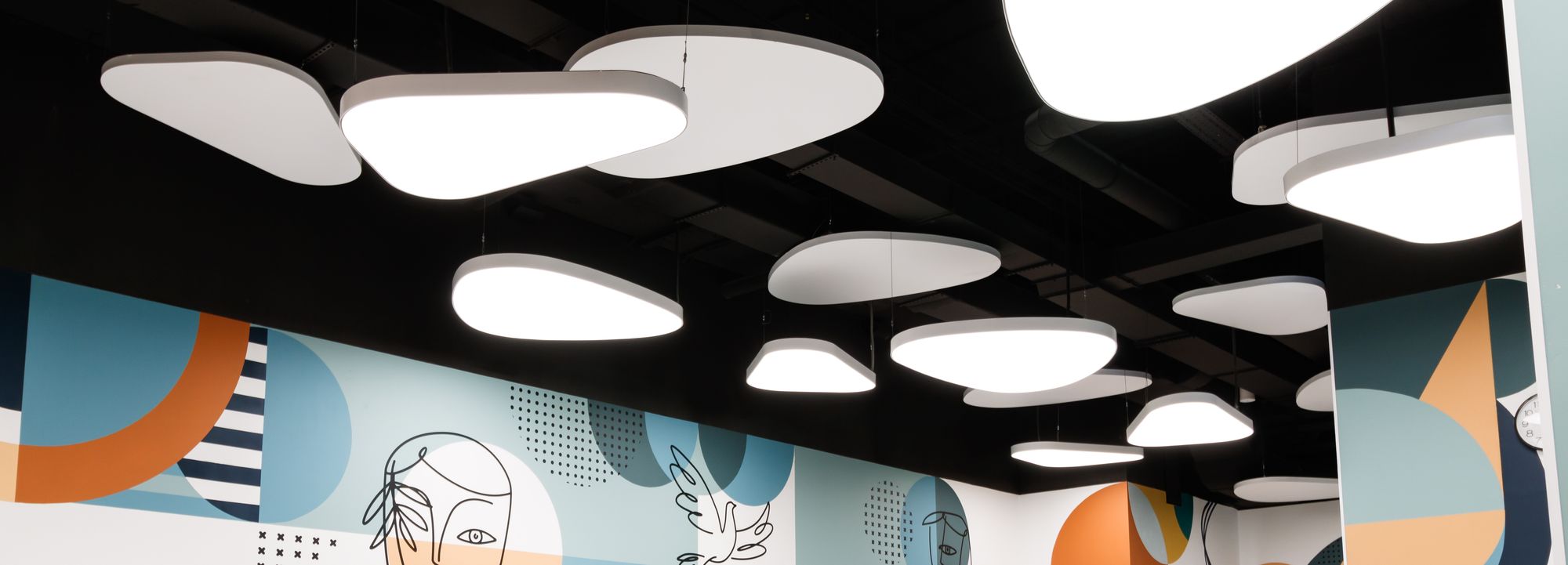 Световой дизайн построен на контрасте белого и красного, широких световых полос и тонких линий света. Линейные светильники с полупрозрачными экранами идеальны для основного освещения. Декоративная подсветка зеркал и других элементов интерьера выполнена светодиодными лентами дневного белого свечения. Границы потолка и стен в фитнес-зонах эффектно подчеркнуты линиями света.