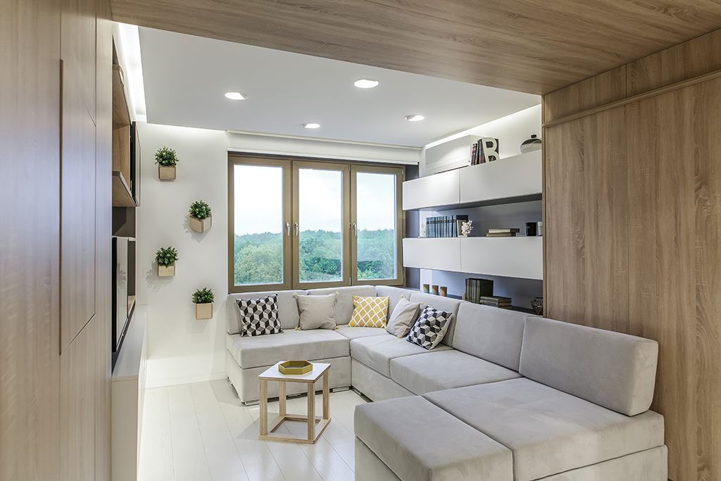 При реализации проекта многофункциональной гостиной в передаче «Квартирный вопрос» основной задачей стала трансформация пространства.