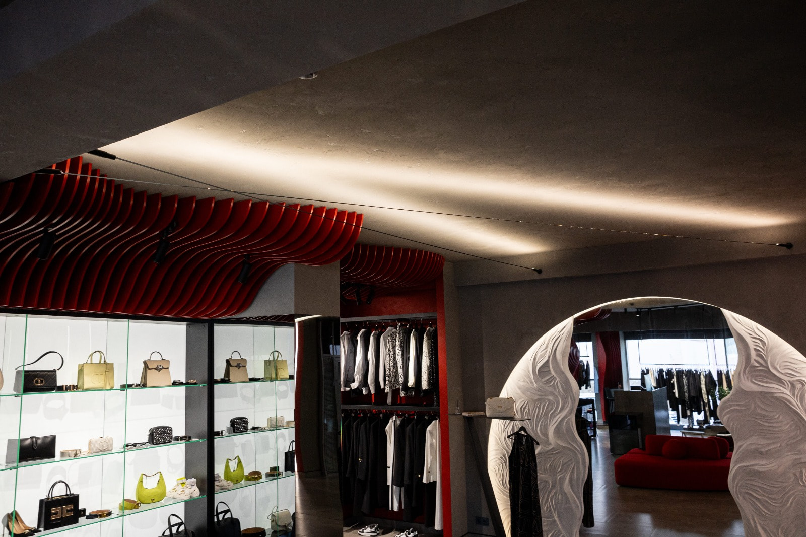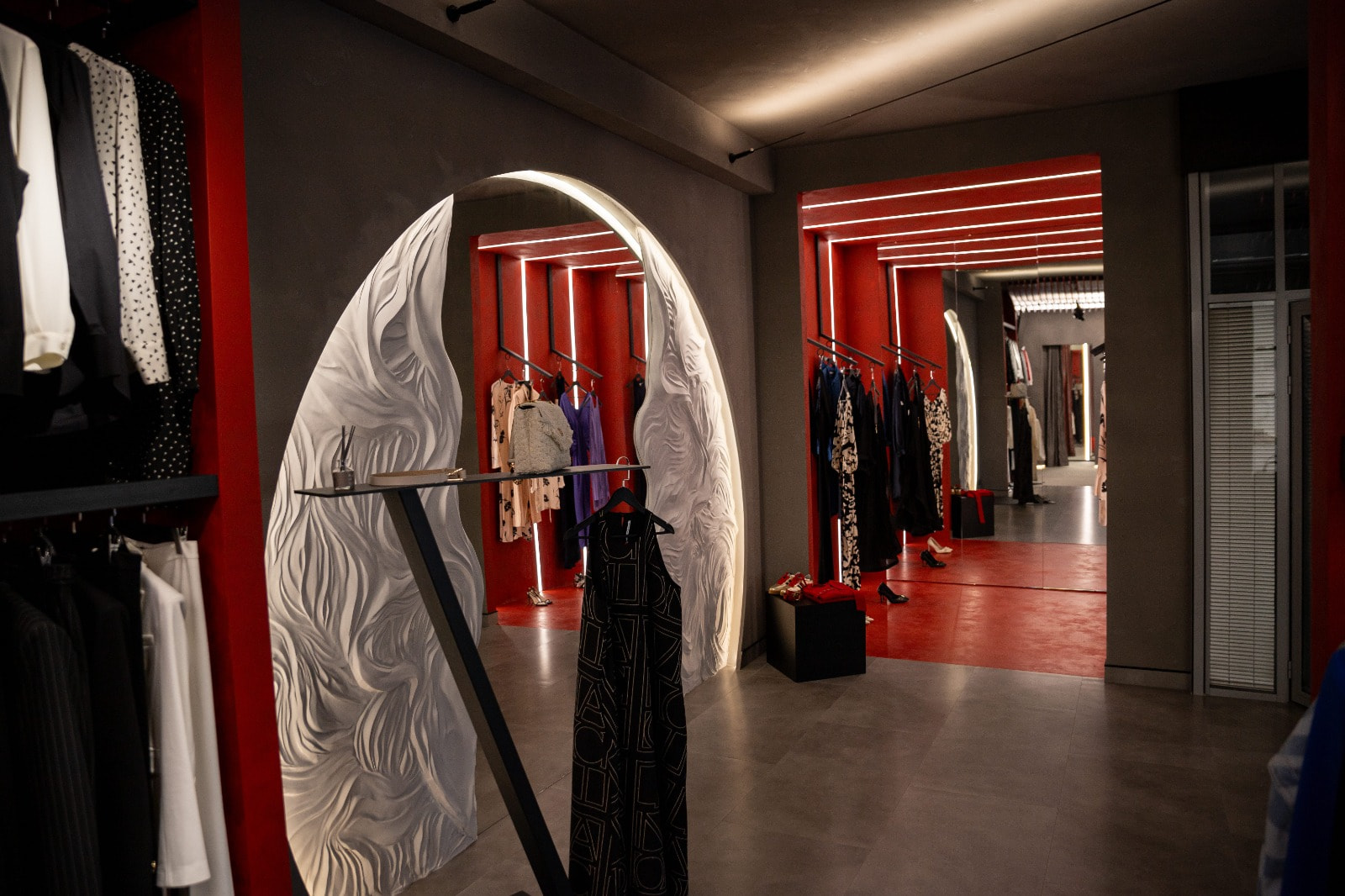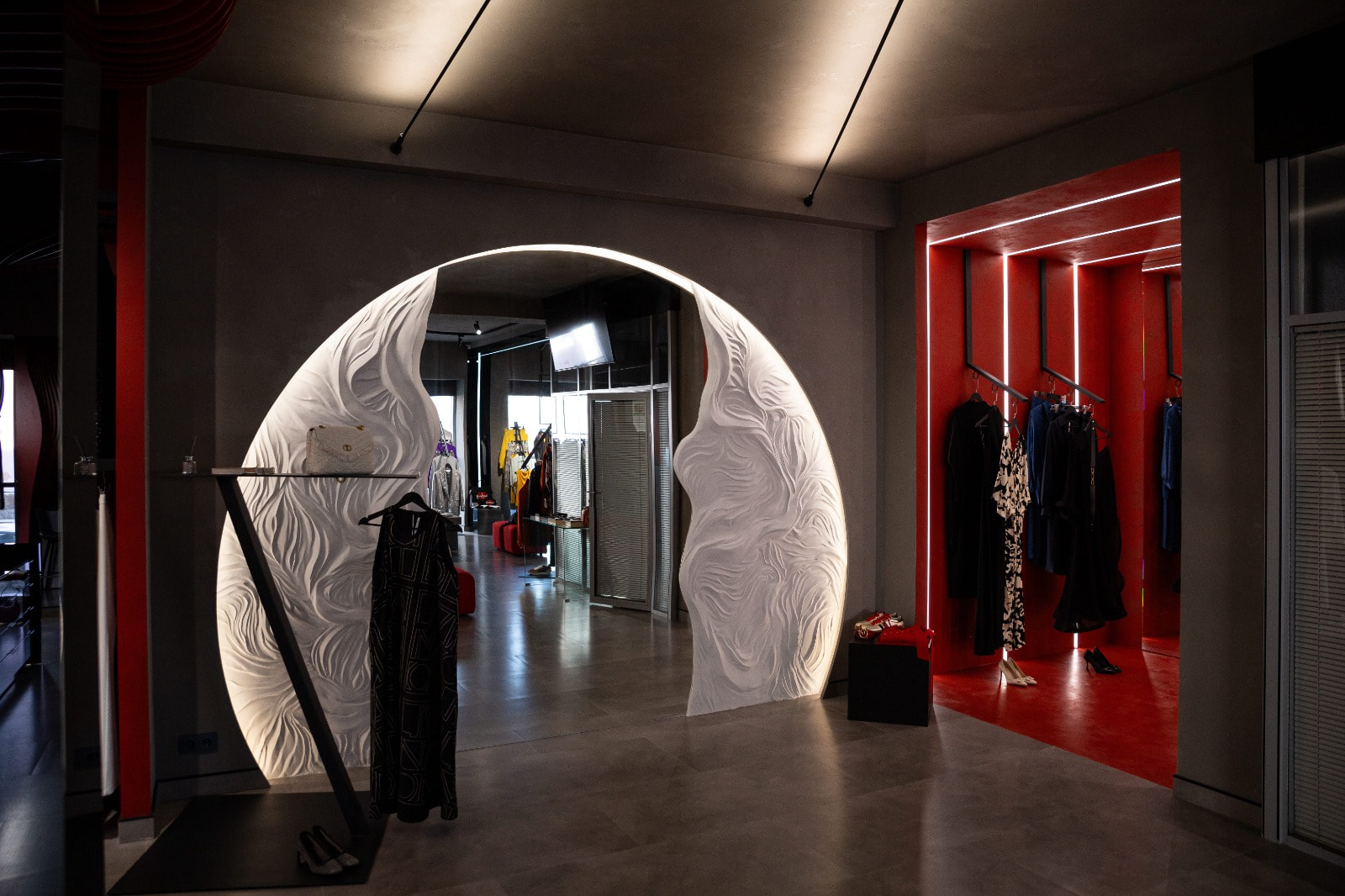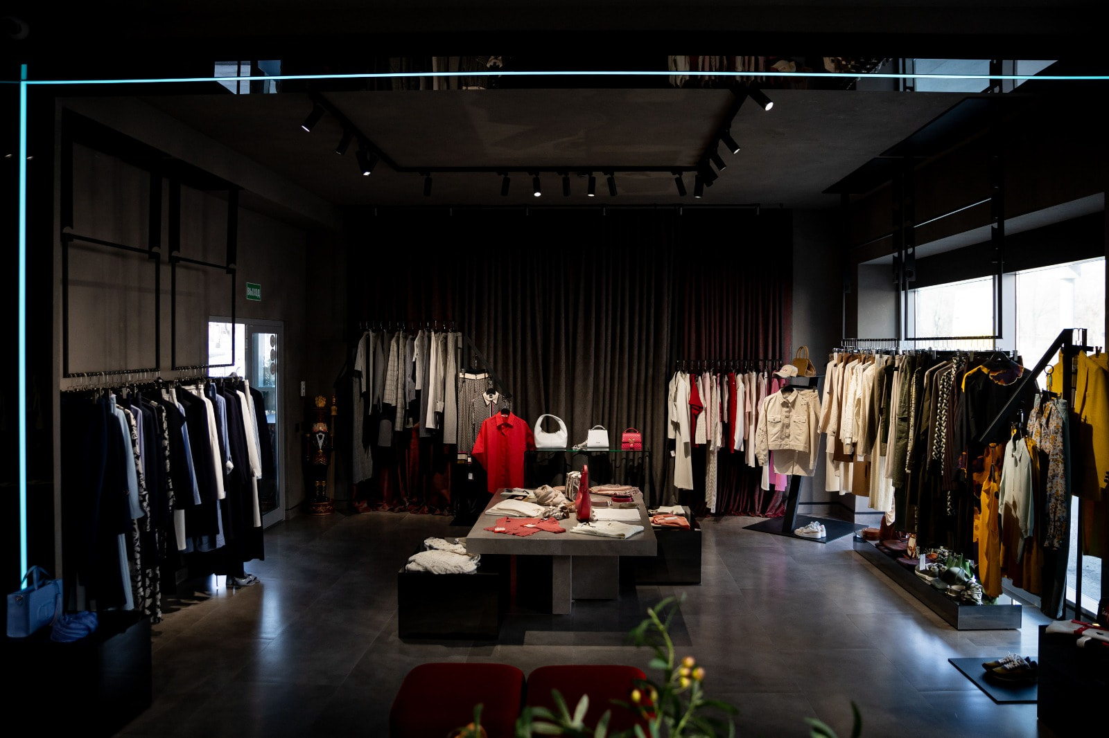 Контурная LED-подсветка добавляет пространству глубины: она обрамляет ниши, стеллажи и декоративные элементы, визуально разделяя зоны и придавая интерьеру современный лоск. Теплый свет в примерочных создает комфорт, а нейтрально-белое освещение в торговой зоне обеспечивает точную цветопередачу.