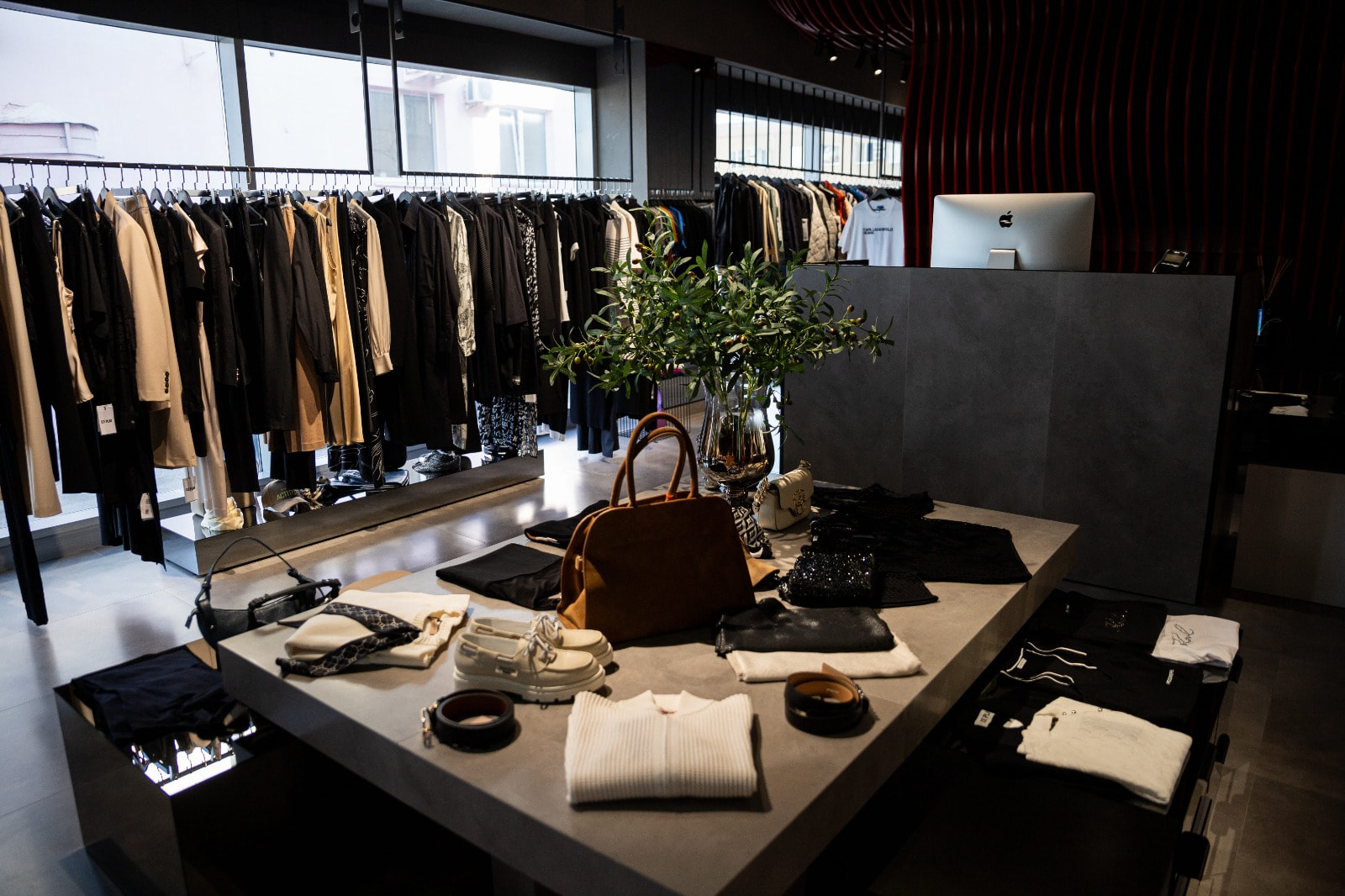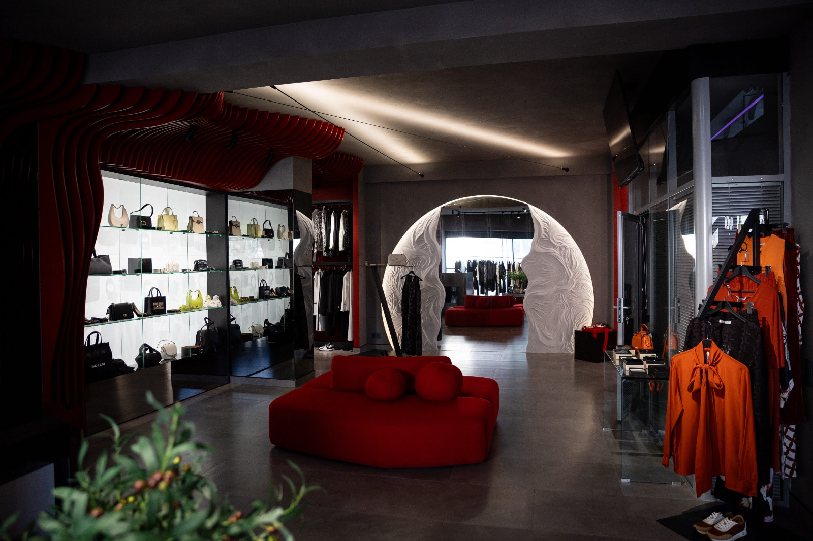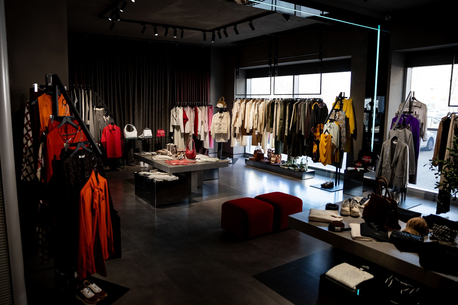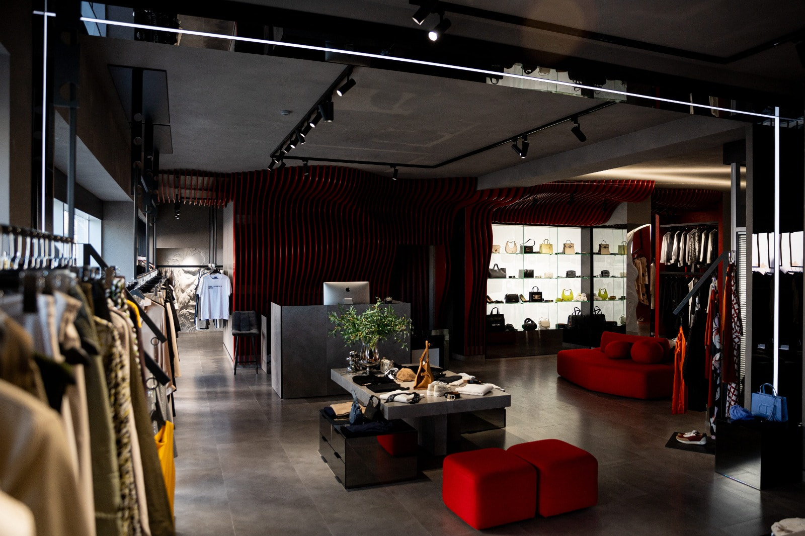 Контурная LED-подсветка добавляет пространству глубины: она обрамляет ниши, стеллажи и декоративные элементы, визуально разделяя зоны и придавая интерьеру современный лоск. Теплый свет в примерочных создает комфорт, а нейтрально-белое освещение в торговой зоне обеспечивает точную цветопередачу.
