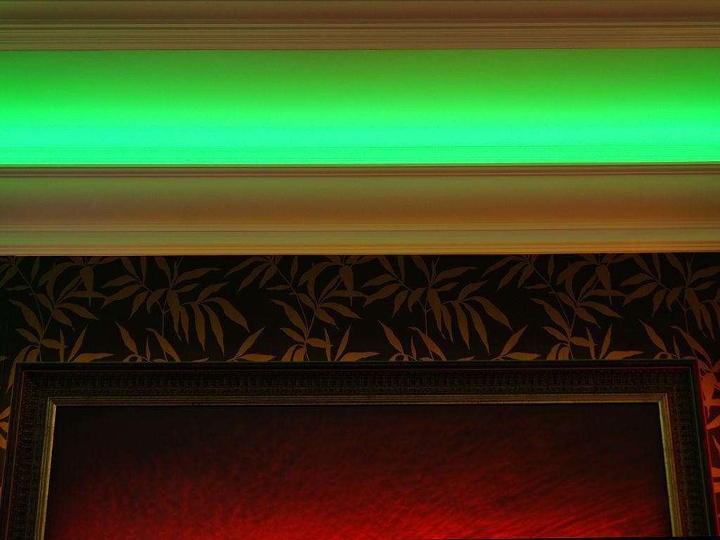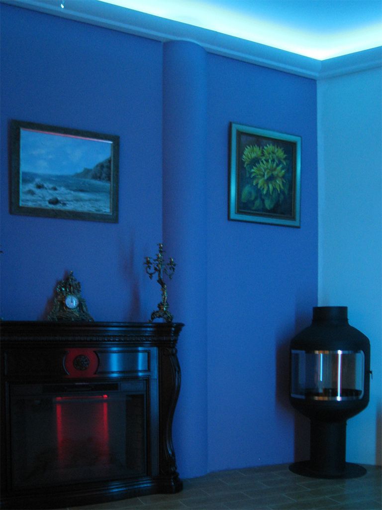 Используя многозонный пульт ДУ, изменять цвет можно в нескольких зонах как одновременно, так и независимо друг от друга, что позволяет добиться интересных цветовых сочетаний. Это можно увидеть на одном из примеров, в котором светодиодная подсветка декоративного камина включена в красном цвете, а подсветка карниза по периметру комнаты - в синем.