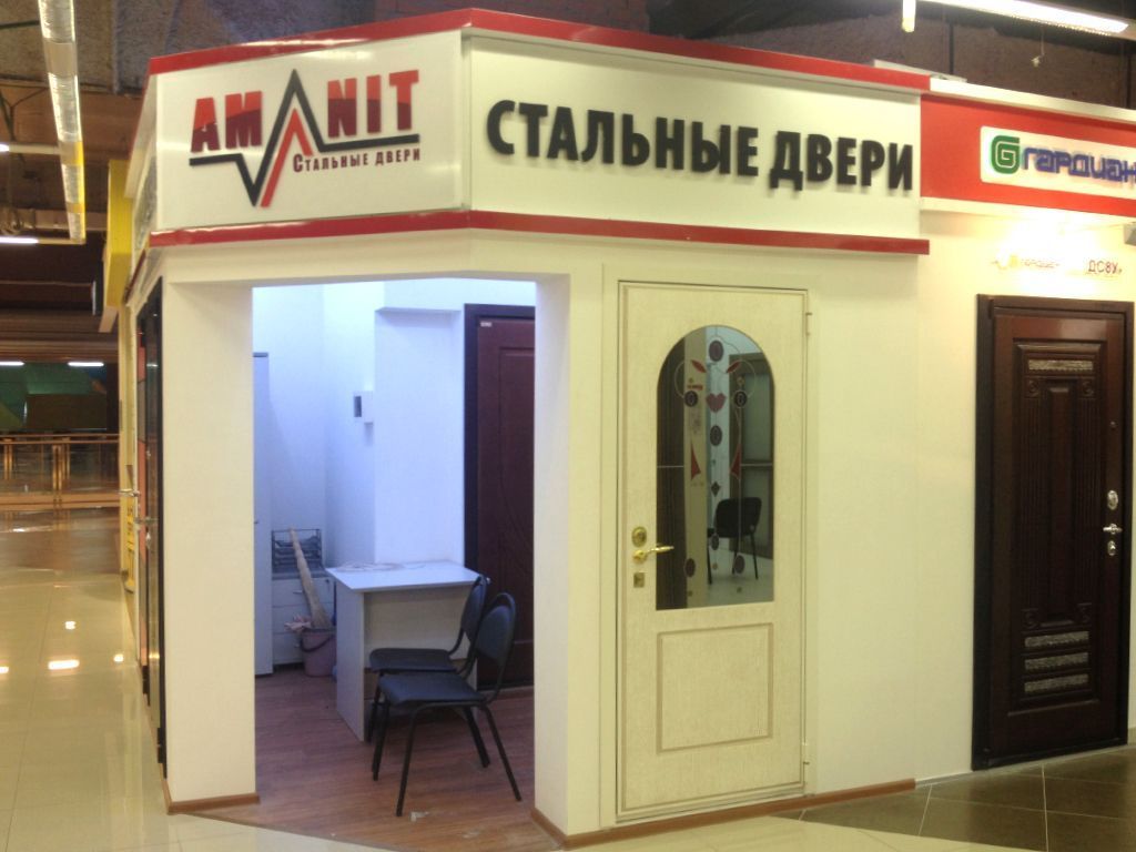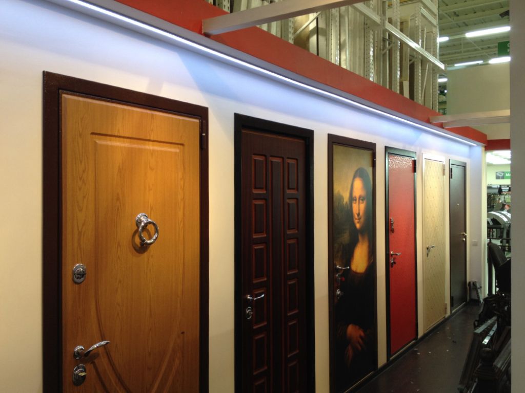 Многоцветная светодиодная подсветка образцов дверей в павильонах торговых центров. Подсветка была выполнена линейными светодиодными светильниками arlight®, изготовленными из алюминиевого профиля с объемным экраном и многоцветной светодиодной ленты arlight®.