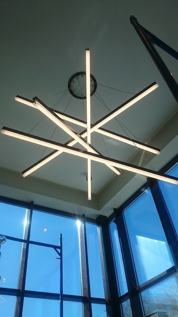 Высота потолка зала в области лестничного пролёта позволила установить объемный светильник, созданный из алюминиевых профилей и подвесов. Подвесы отрегулированы таким образом, что профили находятся на разных уровнях под наклоном. Конструкция получилась объемной, но в то же время лёгкой, что подчеркнуло общий стиль интерьера зала.