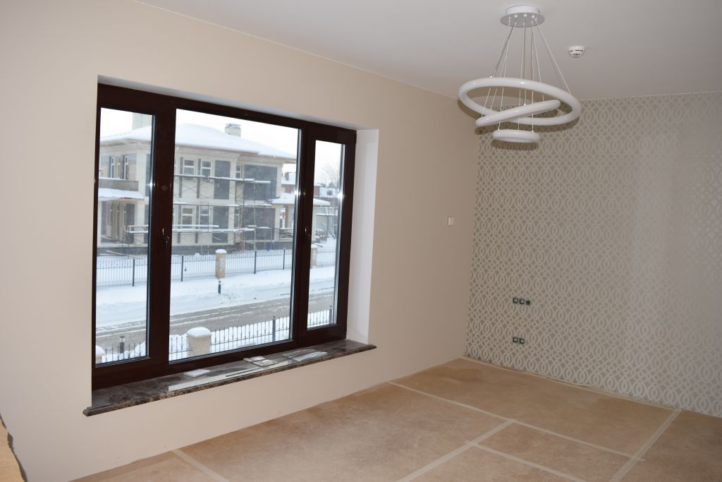 Для освещения в комнатах также использованы светодиодные светильники. В одной из них - светильник, представляющий собой 3 светящихся кольца, зафиксированных на разной высоте и с разным наклоном. В другой были установлены подвесные линейные светильники, собранные из алюминиевых профилей со светодиодными лентами.