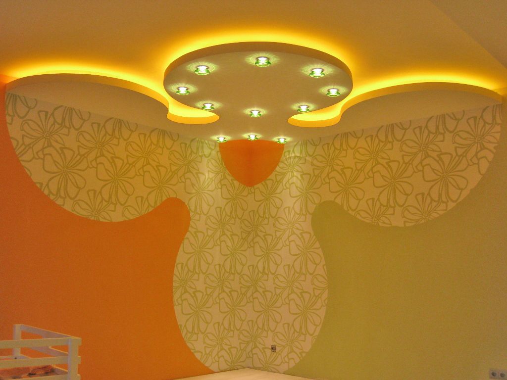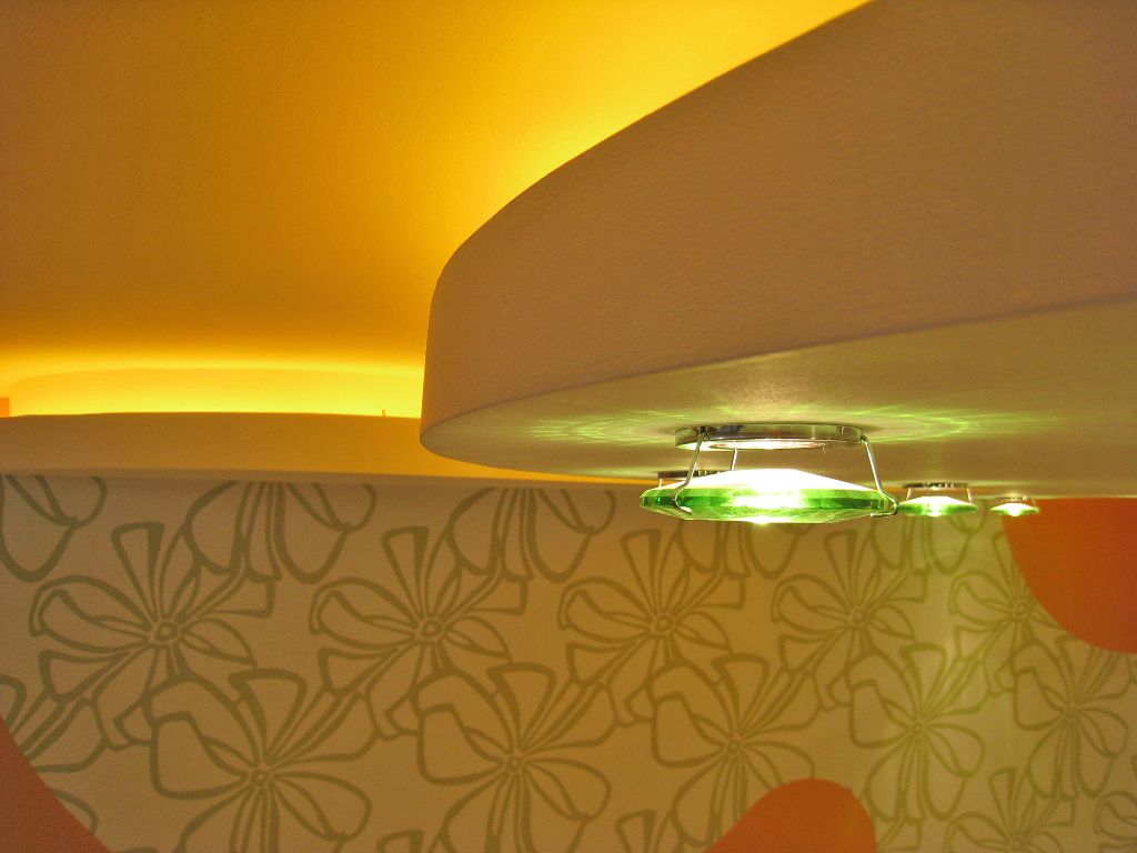 Достаточно низкие потолки не позволили применять привычные люстры, поэтому выбор пал на встроенные светильники, контурную подсветку потолков из гипсокартона и витражные световые потолки.